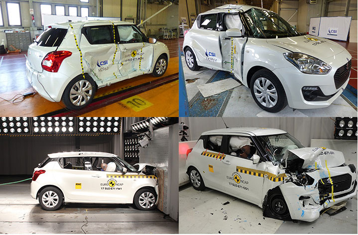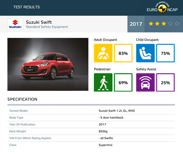 தற்போது விற்பனையில் உள்ள புதிய 2017 மாருதி ஸ்விஃப்ட், யுரோ என்கேப் தரச்சோதனையில் 3 ஸ்டார்களை மட்டுமே பெற்றுள்ளது. பெரியவர்களுக்கான பாதுகாப்பில் 83%, குழந்தைகளுக்கான பாதுகாப்பில் 75% பாதுகாப்பு அம்சங்களை கொண்டுள்ளதாக தெரிவித்துள்ளது.